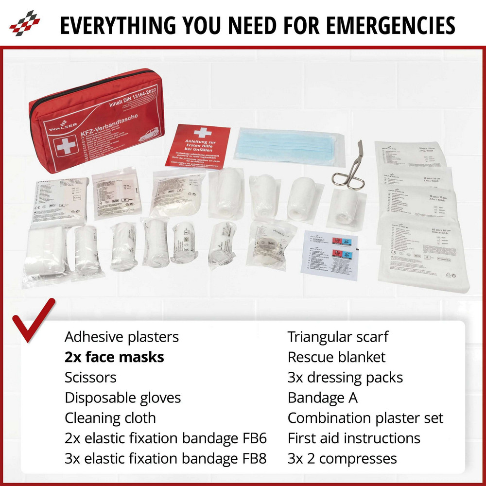 A tartalom megfelel a DIN 13164-2022 szabványnak, így megfelel - többek között - Svájc, Németország és Ausztria törvényi előírásának is. Baleset esetén biztonságosan tud elsősegélyt nyújtani mások számára is.