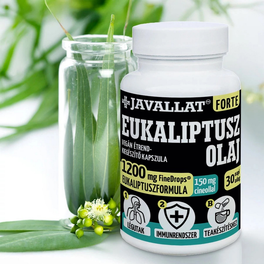 60 db vegán étrend-kiegészítő kapszula, 1200 mg FineDrops® eukaliptusz formulával (150 mg cineolra standardizálva) a napi adagban.