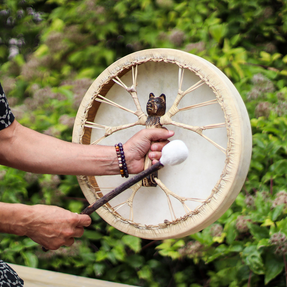 Ami ezt a dobot megkülönbözteti, az a kézzel faragott medvefejes fogantyú a hátoldalon. A medve az erő, a bátorság és a rugalmasság egyetemes szimbóluma, így ez a dob erőteljes spirituális eszköz.